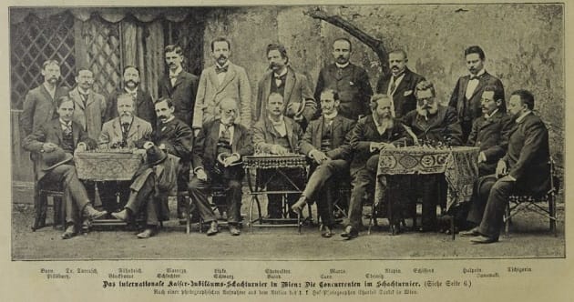 We could not find a photo from the Cologne tournament, the best we have is from the Vienna tournament of that same year. Burn is on the far left standing up in the photo of players from this tournament. The Vienna tournament took place during June and July of that year, and Burn came 7th well behind the leaders. After Vienna, quite a few of those same players played in the Cologne tournament that took place between July 31st and August 19th.